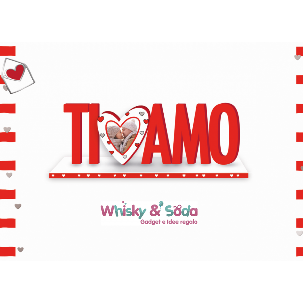 Cornice portafoto in legno su base in colore bianca, scritta ti amo in colore rosso e spazio portafoto a forma di cuore