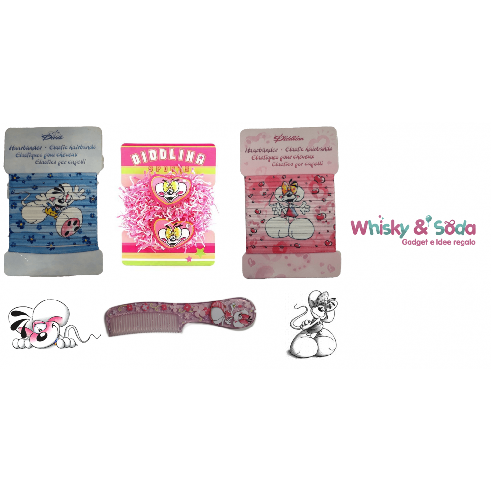 Interessantissimo set composto da: due confezioni (una per colore: rosa per Diddlina e azzurro per Diddl) di elastici per capelli da 12 pezzi cadauna +una confezione da due pezzi di elastici della linea Diddlina sport + un pettine in colore rosa glitter. Una interessante idea regalo o un acquisto da non lasciarsi sfuggire!!!
