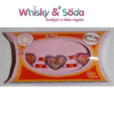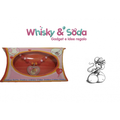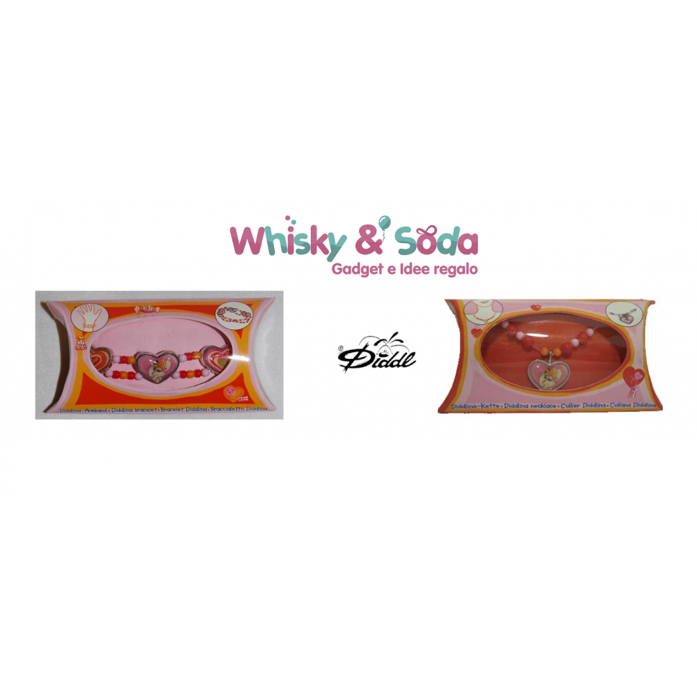 Set bigiotteria composto da bracciale e collanina. Sia il bracciale che la collana sono composti da piccole perline e placchette smaltate a forma di cuore e con l'immagine di Diddlina, assemblati su filo pvc elasticizzato e chiusura a clip per la collana.