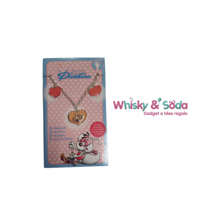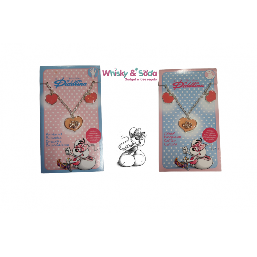 Kit composto da bracciale e collana a catena impreziositi con ciondoli a forma di cuore e motivo della nostra cara Diddlina. Piccoli accessori di moda per essere sempre eleganti; un bel regalo per tutte le donne piccole e grandi! Realizzati con materiali di ottima qualità, placcati in argento, privi di nichel.