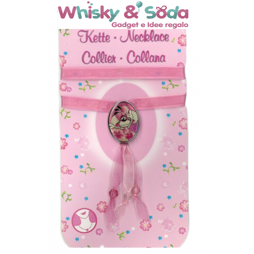 Stupenda collana linea Diddlina ballerina. Il laccio è in raso di colore rosa, il charm raffigura la nostra Diddlina in posa danzante.