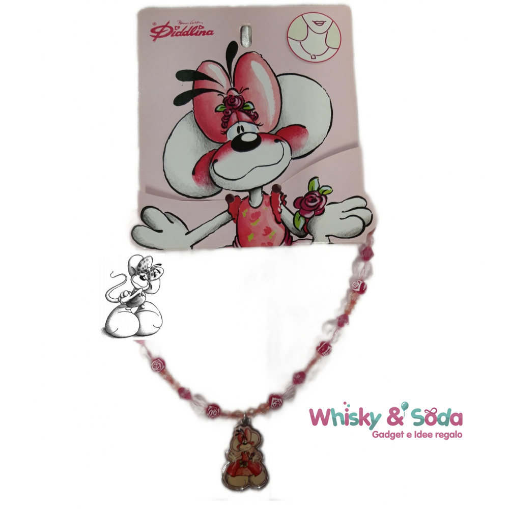 Collana linea Diddlina "red rose, laccio in pvc in colore rosa, impreziosita da perline multicolore e pendente in metallo smaltato con la immagine di Diddlina.
