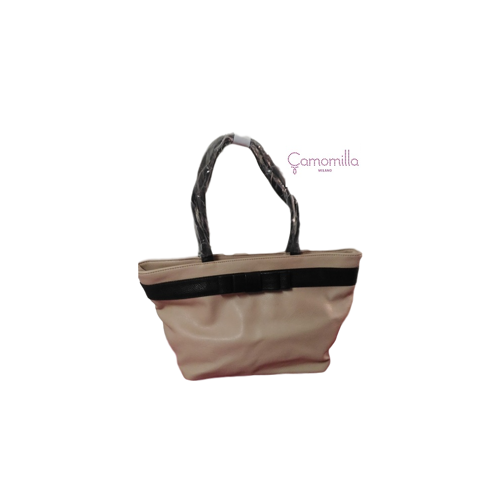 Elegante e pratica borsa di grandi dimensioni della linea ribbon by Camomilla Milano. In contrasto cromatico al corpo di colore rosa pallido, la fascia di contorno con fiocco e manici in colore nero. Sul retro il logo della casa. Si possono abbinare prodotti della medesima linea.