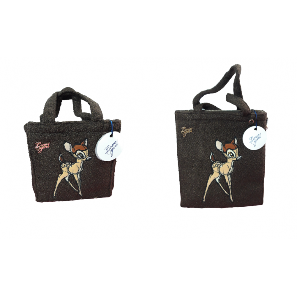 Bellissime borse a marchio "Love Girl" dedicate al giovane cerbiatto Bambi. La linea si sviluppa su due bags di diversa grandezza: la mini bag (con chiusura a bottone) e la medium bag (con chiusura a cerniera). In morbido tessuto effetto vellutato e in autunnale colore brown sono, all'interno, finemente rifinite, inoltre è presente una tasca con chiusura a cerniera.