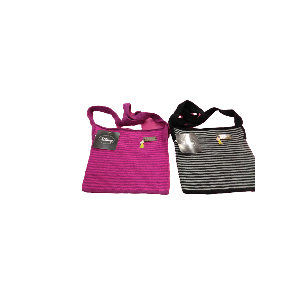 Piccola e semplice borsetta in acrilico, in due colori a righi alternati con sfumature cromatiche, con l'immagine su piastrina del nano Cucciolo. Ideale per le più piccine, è una simpatica ed apprezzata idea regalo.