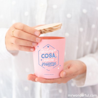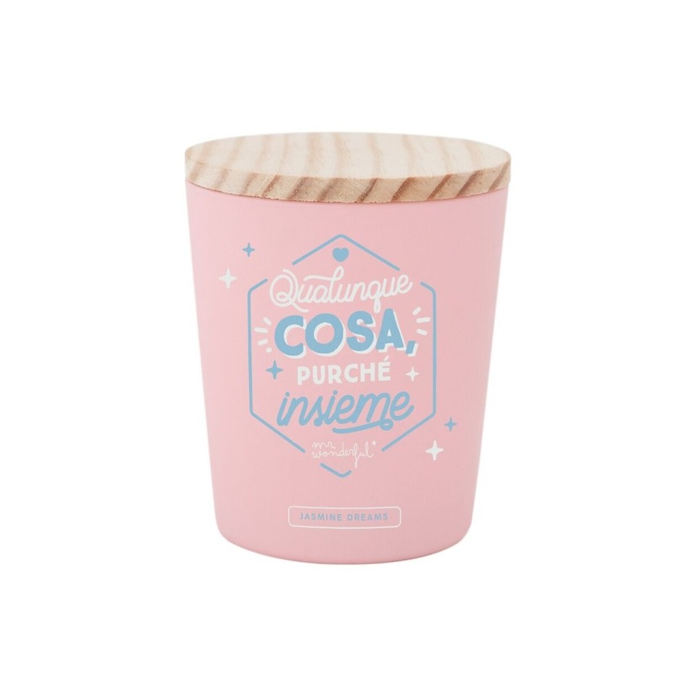 Questa candela con profumazione Jasmine Dreams fa scattare l'amore a prima vista. Candela in cera vegetale (al 100%), conservata in un grazioso contenitore in vetro, con un raffinato tappo in legno che vi permetterà di conservarne il più a lungo possibile il delizioso profumo. Sul barattolo è incisa una frase che sembra scritta da Cupido in persona: "Qualunque cosa, purché insieme". Sorprendi l'altra parte di te: organizza una soirée a due, ovviamente a lume di candela, abbandona il cellulare per qualche ora e dedicale tutte le attenzioni che si merita... basterà accenderla e abbracciarvi fortissimo per creare un momento unico magico e indimenticabile, al pari della vostra bellissima storia d'amore.