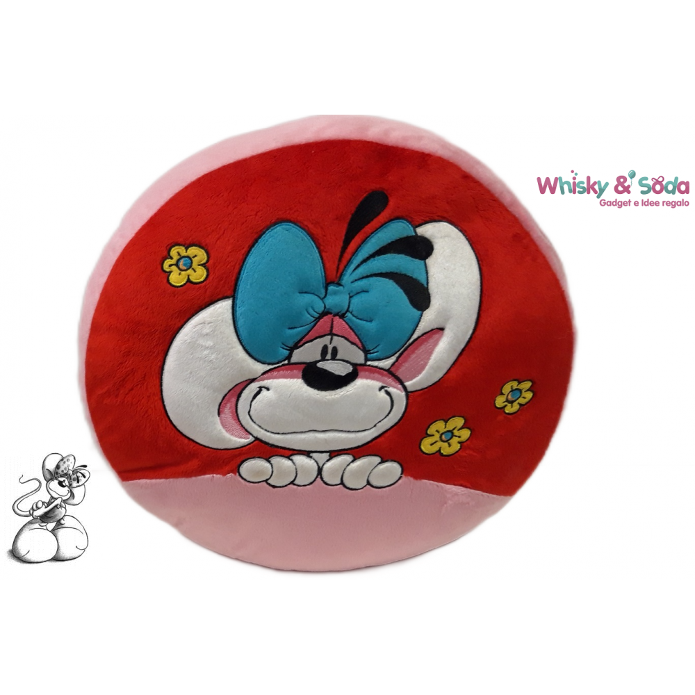 Bellissimo e morbidissimo cuscino in peluche di forma rotonda in colore rosso e rosa, dedicato alla nostra Diddlina e al suo fidato amico Galupy. Molto particolare il faccino in rilievo di Diddlina.