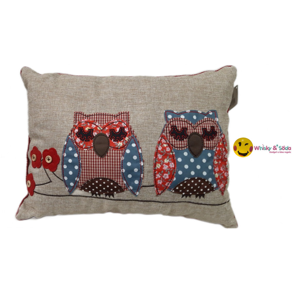 Bellissimo cuscino in tessuto, che richiama nei colori e nella percezione del materiale la juta. Le civette e gli altri elementi presenti sono applicati. Lavabile a 30° ciclo delicato.
