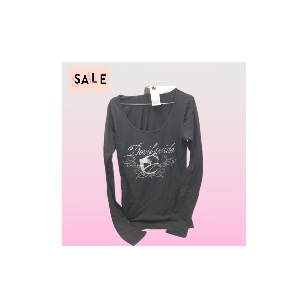 Per ragazze che amano essere fuori dagli schemi e creare tendenza, proponiamo questa bellissima e particolarissima T-Shirt manica lunga con asola a marchio Dark Dudes by Depesche. In colore nero, ampio girocollo, grafica in colore argento, scritta con glitter termo applicati