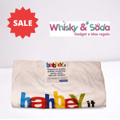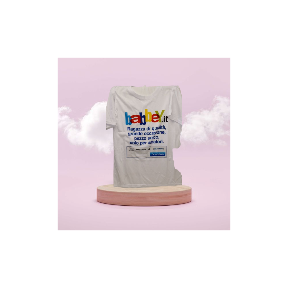 Simpatica maglietta, in colore bianco, con scritta: "babbey.it - Ragazza di qualità grande occasione, pezzo unico, solo per amatori..."...
