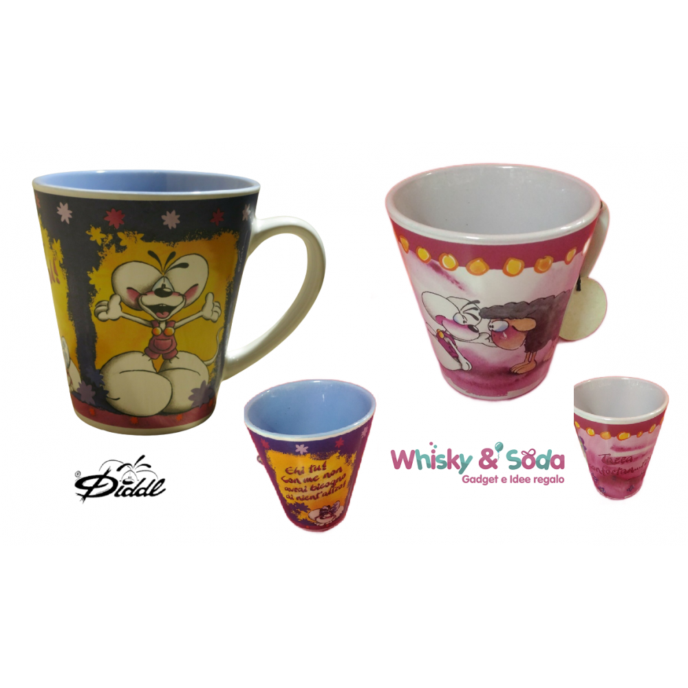 Tazze a forma conica, in ceramica pesante, con interno colorato. Sono disponibili due grafiche (figure) differenti, con frasi e personaggi. Ideali per bevande da consumare calde.