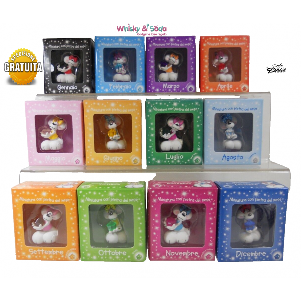 Miniature in pvc raffiguranti Diddlina. Ad ogni mese è abbinata una pietra.
