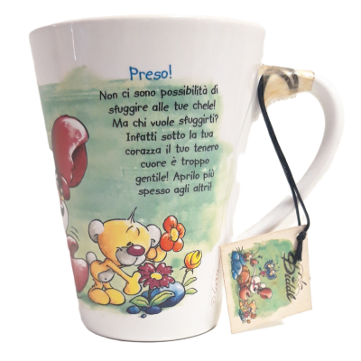 Tazza zodiacale segno cancro, formato alto, ideale per sorseggiare bevande calde realizzata in ceramica leggera, dalla grafica simpatica ed accattivante. La grafica della tazza prevede su una facciata il personaggio Diddl in compagnia del fidato amico Pimboli mentre l'altro lato propone una simpatica didascalia. Per i veri appassionati del fantastico mondo Diddl!!!