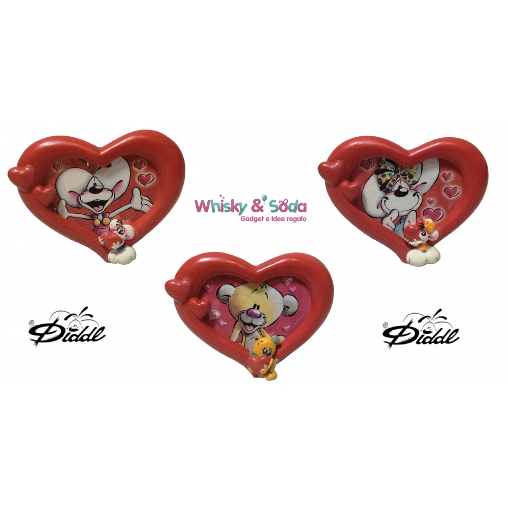 Mini cornice in resina a forma di cuore con applicazione, sempre in resina, dei personaggi Diddl, Diddlina e Pimboli. La cornice può essere usata sia come portafoto da tavolo, che come quadretto da appendere a parete tramite l'apposito anellino in dotazione.