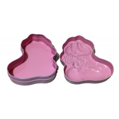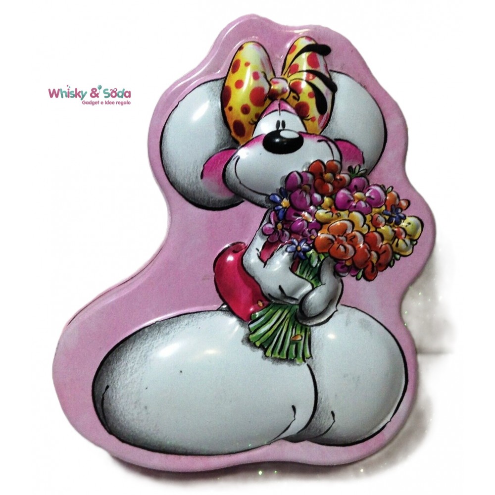 Latta contenitore sagomata raffigurante il personaggio Diddlina con un mazzo di fiori n delicatissimo colore rosa.