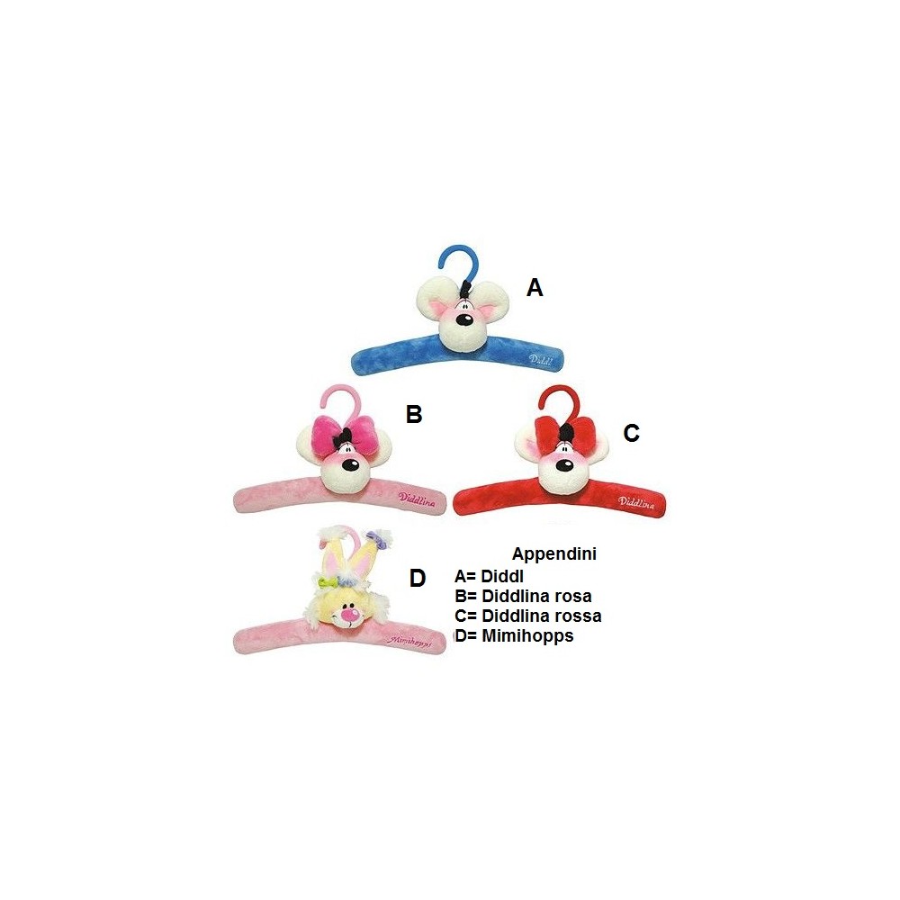Appendino per abiti in peluche: il prodotto è caratterizzato dalla presenza del personaggio di Diddl (fig. A), Diddlina (fig. B e C), oppure Mimihopps (fig. D)