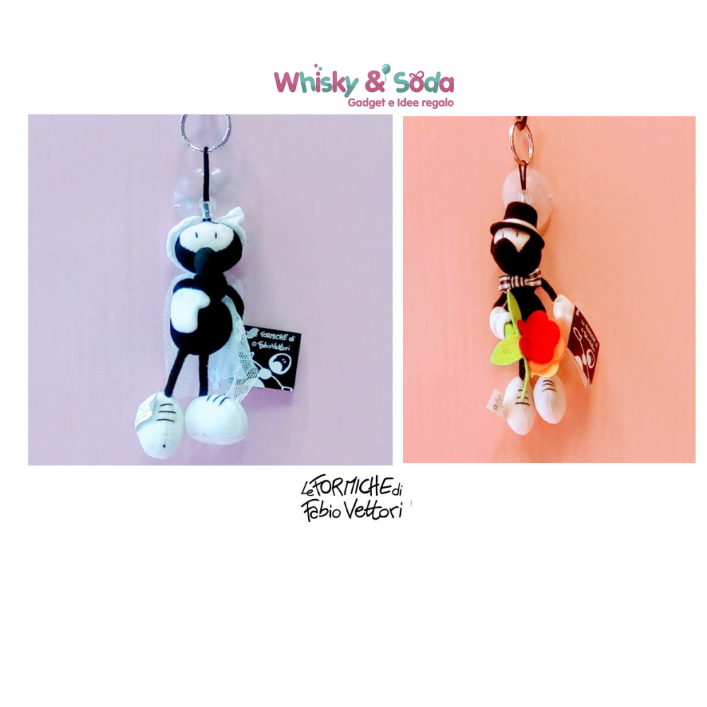Le mitiche formichine di Fabio Vettori in un rarissimo formato peluche, nello specifico nel modello sposa/sposo. Unitamente all'anello portachiavi, è presente anche una ventosa per eventuale applicazione su vetro o qualsiasi superficie liscia. Una simpatica ed originale idea regalo!