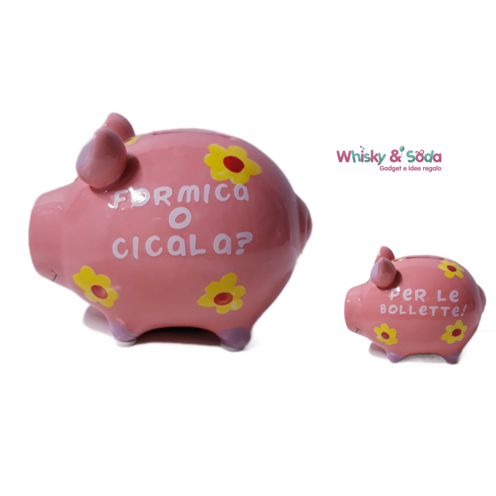 Classico salvadanaio a maialino, con dedica. figura A "formica o cicala", figura B "per le bollette! Una simpatica idea regalo.