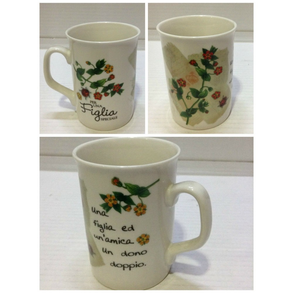 Frase completa: "Per una figlia speciale: una figlia ed un'amica un dono doppio". Bellissima tazza in fine ceramica con decori e dedica.